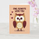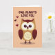 This greeting card features a cute, stylized owl centered on a warm peach background. The owl has a plump mid-brown body with a creamy beige belly and beige circles around its big eyes. Its eyes are large and shiny with small highlights, giving it a gentle, curious, loving look. Deep reddish-brown details show up in its ear tufts and simple wing shapes, and three small hearts float up along the left side, getting smaller as they rise. Above the owl, the message “OWL ALWAYS LOVE YOU” appears in uppercase block letters in the same deep reddish-brown color. A small flat shadow under the owl helps it feel grounded while keeping the design simple and tidy. It’s a sweet choice for romance or friendship, with an easy message that lands right away ❤️💌🍫.