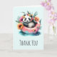 Carte de remerciements avec une adorable image estivale. Une aquarelle avec un panda noir et blanc assis dans une bague de baignade dans l'eau. Entouré de jolis fleurs sauvages. Un ours totalement froid.