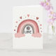 This greeting card features a softly curved rainbow in muted bands of dusty rose, blush pink, warm taupe, and a grounding gray stripe on a white background. Two peach-toned clouds sit at the base of the rainbow, giving the design a cozy, caring feel. Small hearts and tiny dots are scattered around the card in shades of pink and red-brown, adding a sweet touch of affection ❤️. Near the center, the word “LOVE” is printed in simple black block letters, easy to read and calm in style. Just above the word is a small outlined daisy with a light pink center, like a gentle little reminder of kindness. The layout feels balanced and light, with the hearts floating around the main image without taking over. It’s a thoughtful choice for romance, friendship, or a simple “thinking of you” note