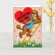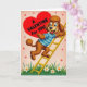 This cute dog greeting card shows a vintage-style scene with a brown, poodle-like dog climbing a bright yellow ladder toward a huge red heart. The dog has textured fur, wide eyes, and a big happy smile, and it’s wearing a blue-and-white striped shirt. In the upper left area, the large heart carries the message “A VALENTINE For YOU” in black block letters, with “For YOU” standing out clearly. The background is soft pink with a few small red hearts scattered around, keeping the focus on love and friendship. At the bottom, there’s green grass with simple white daisies that ground the scene and make it feel sweet and familiar. The diagonal layout leads your eye from the flowers up the ladder to the heart, like the dog is working hard to deliver a loving note ❤️💌.