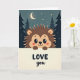 This greeting card shows a sweet little hedgehog peeking over a creamy white banner with a gentle smile. Its big shiny black eyes, tiny lashes, and light pink blush on its cheeks make it look shy and caring. Behind it is a night sky in deep teal and midnight blue, with a small crescent moon and scattered stars glowing above. Dark green evergreen trees stand on both sides, giving the scene a quiet, cozy forest feel. On the banner, the words “LOVE you” appear in dark lettering, with “LOVE” larger and “you” set slightly higher to the right. The simple picture and calm colors make it feel like a soft moment you’d want to share with someone close 🥰. It’s a meaningful choice for a partner, close friend, or anyone you want to remind that they matter ❤️.