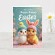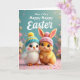 This card features two fluffy, stylized baby animals posed close together, their gentle, matching gazes suggesting a sweet bond 🐰. On the left stands a white chick wearing a teal-and-yellow striped knitted beanie topped with a round pom‑pom, with big shining eyes and faint pink blush on its cheeks. Beside it is a golden-orange young rabbit with tall ears, dressed in a soft pink knitted hat with its own pom‑pom 🐇. The background is a calm teal wash with softly blurred pastel flower shapes that hint at early spring. Along the bottom, a bright pink foreground is scattered with tiny candy-like sprinkles in several colors, adding a festive, sugary touch. Across the top, a seasonal greeting appears in white lettering, centered and easy to spot against the teal. The light looks diffused and gentle, giving the hats and fur a cozy texture without harsh shadows. A few pale floral smudges sit behind their heads, while the sprinkles cluster more densely near the lower edge.