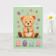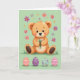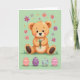This greeting card shows a cute, stylized bear-like creature centered on a mint-green background, colored in warm golden-brown and cream with wide dark eyes and rosy cheeks. Its small paws gently cradle a few green blades, and the tender tilt of its head gives it the look of quietly sharing a sweet moment with someone close 🐰. Along the lower area, four decorated egg shapes sit on a faint grassy strip, each patterned with stripes, dots, and tiny flowers in pastel pink, deep purple, and calm blue. Scattered blossoms in fuchsia, violet, and soft orange float across the background like they’re drifting on a light spring breeze 🌷. Any greeting text would sit near the top in a simple, dark tone that stands out against the mint field, with smaller wording placed below the character in a lighter shade. Soft shading and subtle texture add a cozy, touchable feel to the character and the eggs without heavy outlines. The bottom row shows four eggs in a neat line, each with different patterns, resting just above the green ground line.