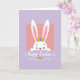 This card shows a stylized white bunny 🐰 with long ears peeking from behind a rounded peachy-pink rectangular frame, as if leaning in to greet someone close. Its simple dark eyes and tiny nose give it a gentle, friendly look, like it’s sharing a quiet moment with you. A small bow on its head mixes orange, green, and blue, adding a bright accent against the white fur and soft background. The main backdrop is lavender, keeping the scene calm and springlike while the coral-toned frame adds warmth. Beneath the bunny, a seasonal greeting appears in white lettering centered near the bottom, with light curling flourishes around the words. Nearby sit two decorated egg shapes with wavy stripes in multiple colors, echoing the bow and adding a cheerful rhythm. A small 🌷 detail can be imagined in the overall spring palette, as the elements feel arranged like a sweet exchange between friends. The eggs rest below the text, and the bunny’s ears rise above the top edge of the peachy frame.