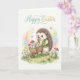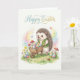 A charming watercolor illustration of an adorable hedgehog holding a floral pink umbrella with Easter eggs on soft grass. Perfect for a whimsical spring greeting.