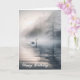 Un cygne glisse gracieusement sur un lac serein entouré de brouillard, avec des arbres élégants et des oiseaux lointains qui renforcent l'atmosphère tranquille pour l'anniversaire.