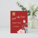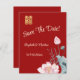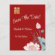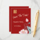 Ce mariage chinois traditionnel coffre-fort la carte date dispose d'une fleur de lotus aquarelle peinte sur un arrière - plan rouge. Avec un titre "save the date" dans un élégant script manuscrit et un texte personnalisé dans une police sans serif moderne.
