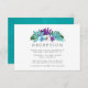 Carte de réception de mariage aux feuilles tropicales et orchidées aquarelle colorées avec un verso lavis aquarelle bleu turquoise.