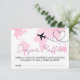 Ce design présente un baby shower à thème aventure "Un petit explorateur est à l'atterrissage bientôt" avec une carte du monde couleur rose et un petit avion mignon sur la route. Le thème minimaliste et moderne du baby shower de filles.