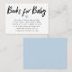 Insérez d'invitation de demande de livre moderne pour votre baby shower garçon. Le texte en haut indique "livres pour bébé" dans une police de caractères de script moderne avec une explication de la façon dont vous souhaitez que les invités apportent un livre pour votre bébé au lieu d'une carte. Il y a un coeur bleu au milieu qui correspond à la couleur au dos de la carte.