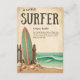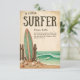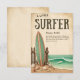 Cette invitation à baby shower d'inspiration vintage présente un thème de surf rustique avec un arrière - plan beige patiné, une planche de surf classique à rayures vertes appuyée sur une clôture en bois, et des coquillages épars sur le rivage sablonneux. La scène est complétée par des vagues turquoise de l'océan avec une petite planche de surf à cheval sur la houle, évoquant un charme nostalgique au bord de la plage. Si vous avez besoin d'un autre produit correspondant ou de la personnalisation, veuillez envoyer un message via Zazzle.