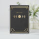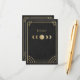 A refined vertical Art Deco details card featuring celestial gold accents, moon‑phase inspired geometry, and a dramatic black backdrop. Designed for modern weddings with a luxurious vintage aesthetic, this card presents event information with clarity, elegance, and cohesive celestial styling. Please note: not real gold or gold foil.