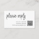 Rendez votre processus de réponse de mariage transparent avec notre carte de réponse avec code QR. Cette carte personnalisable présente une écriture noire moderne sur un fond blanc épuré. Le design comprend une zone de texte personnalisable et un espace pour générer un code QR unique que les invités pourront utiliser pour répondre facilement via leur smartphone. Allez à l'option "personnaliser", ajoutez l'URL de votre site web de mariage dans la zone prévue à cet effet, et un code QR sera généré sur le design rien que pour vous. Rendez votre jour spécial encore plus mémorable avec cette carte de mariage chic et fonctionnelle.