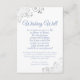 Cette belle carte mariage est une façon de demander à vos invités de l'argent ou de l'argent en guise de cadeaux. L'élégant design présente une dentelle en faux feuille argent ornée d'un arrière - plan blanc dans les coins et des lettres de script bleu poussiéreux ou vert-permule. Le titre se lit "Wishing Well" avec un poème mignon : "Tandis que nous commençons notre nouvelle vie en tant que Mr. & Mme Nous avons déjà une maison pleine de plats Mais si vous voulez nous donner un cadeau Un cadeau de quelques espèces serait si agréable! Il y a de l'espace en bas pour une note et une signature courtes.