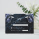 Cette élégante carte de réponse de mariage comporte des bouquets floraux bleu marine mis en valeur avec de la verdure en faux foil argenté dans deux coins, sur une image de fond d'agate aquarelle bleu marine. Le texte personnalisable combine des polices sérif et manuscrites gris argent. Le verso présente un design floral et agate bleu marine et argent assorti.