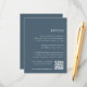 Carte tout-usage pour vos invitations de mariage, cette petite carte de détails fournit trois champs de texte personnalisés pour vos détails de mariage, le site Web, et un code QR pour les RSVP ou des informations supplémentaires. Un design simple basé sur la typographie, avec une atmosphère minimaliste, avec des lettres blanches classiques sur un arrière - plan bleu foncé.
