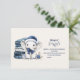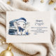 Célébrez un baby shower d'hiver avec ce design adorable avec un petit éléphant peint à la main dans un chapeau de Père Noël, entouré de couvertures pliées et d'ornements bleus festifs. Les textures douces d'aquarelle et les tons marine cool créent une atmosphère magique et cosy, parfaite pour accueillir un bébé pendant la période des fêtes.