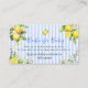 Bring Italian charm to your baby shower with our Blue Citrus Lemons Ciao Baby Books for Baby Card! Featuring a classic blue stripe background and vibrant lemon design, this enclosure card perfectly complements your Ciao Baby theme. Encourage guests to share their favorite children’s book instead of a card, creating a lasting library for your little one. A sweet and stylish addition to your Italian-inspired celebration, this card coordinates beautifully with matching invitations and decorations.