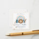 Ces jolies cartes personnalisées pour un baby shower sont dotées d'une illustration de safari bohème de style aquarelle. Le mot garçon a une tête de lion au centre. Un arc-en-ciel bleu et beige de sauce est représenté à l'arrière. Les mignons lotus pawprints sont imprimés le long de la gauche.