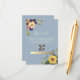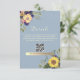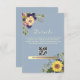 Elégante, rustique, boho, botanique, bleu poussiéreux carte de détails mariage avec code QR, site Web, fleurs d'aquarelle et tournesols.