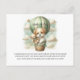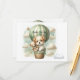 Adventure themed baby shower "Books for Baby" enclosure card with an adorable white and tan puppy holding a teddy bear riding in a green hot air balloon. The watercolor green sky has white clouds with surrounding gold stars. An open book outline on front with poem on the back.