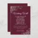 Cette belle carte mariage est une façon de demander à vos invités de l'argent ou de l'argent en guise de cadeaux. L'élégant design comprend un arrière - plan bordeaux, marron ou rouge vif, avec des coins décoratifs en faux feuille argent orné et d'élégants lettrages. Le titre se lit "Wishing Well" avec un poème mignon : Comme nous commençons notre nouvelle vie en tant que M. & Mme Nous avons déjà une maison pleine de plats Mais si vous voulez nous donner un cadeau Un cadeau de quelques espèces serait si agréable! Il y a de l'espace en bas pour une note et une signature courtes.