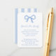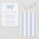 Cette carte de boîtier de baby shower présente un arc bleu peint à la main. Le texte est un poème demandant aux invités d'apporter un livre au lieu d'une carte, mais tout le texte peut être customisé à vos besoins. Au verso se trouve un motif à rayures Regency bleu et blanc.