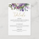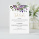 Cette somptueuse suite de Faire-part de mariage possède un bouquet floral d'aquarelle en violet, violet, lilas et blanc. Éléments botaniques eucalyptus et verdure. Parfaite pour un mariage moderne boho, cette suite comprend un design moderne simple et des détails de script cursif doré.