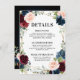 Élégante et moderne carte de détails de mariage romantique géométrique à l'aquarelle avec de belles roses à l'aquarelle burgundy / marsala, rose blush, pêche, bleu marine avec feuillage assorti sur fond en bois rustique bleu marine et cadre doré. Parfait pour un mariage d'automne / mi-été. Veuillez trouver plus de modèles et de variations assortis dans ma boutique "blissweddingpaperie". Et n'hésitez pas à me contacter pour une personnalisation ou des articles assortis supplémentaires.