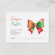 Red and green bow, Santa hat and snowflakes Christmas Santa Baby shower Diaper raffle enclosure card. This festive Christmas baby shower card is adorned with a prominent, impressive red and green bow covered with snow and with a snowflake at its center and a Santa hat. The phrase "Diaper raffle" is written in script and decorative typography. The reverse includes a playful pattern of varying red and green stripes, interspersed with charming snowflakes and snow.
