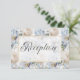 Cette conception de carte de réception de mariage présente un beau motif floral rustique bleu et blanc sur un fond vieilli bleu pervenche poussiéreux. Le texte est affiché sur une zone de texte transparente blanche douce avec un cadre à paillettes dorées fausses. Le dos continue le motif floral. Cette carte fait partie de la collection de mariage Cadre doré floral rustique bleu et blanc créée par Simply Farmhouse Press.