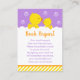 Cette carte de demande de livre mignonne et amusante comprend un adorable canard jaune et canard en bulles de bain savonneuses blanches sur un arrière - plan violet clair avec un ruban orange et des rayures jaunes. Le texte combine écriture manuscrite et polices sans serif pour un look élégant et moderne. C'est parfait pour un Baby shower.