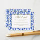 Inspiré par les motifs italiens traditionnels, ce design blanc et bleu a été dessiné à la main à l'origine et est donc exclusif à notre magasin. Cela vous permet de marquer efficacement votre mariage de manière élégante et raffinée, en puisant dans l'esthétique méditerranéenne traditionnelle. Que votre mariage ait lieu en Italie, en Grèce, dans des lieux environnants, ou que vous souhaitiez simplement insuffler cette essence dans votre célébration, nos Cartes d'Enveloppe Siciliennes de style Italien Bleu sont conçues pour cela. Elles sont entièrement personnalisables, vous permettant de les adapter à vos souhaits. Pour commencer, cliquez simplement sur 'Personnaliser ce modèle'. Si vous cherchez des décorations de mariage assorties dans ce thème, explorez notre collection complète – un moyen facile et agréable de préparer tous les détails charmants pour votre jour spécial. Si vous incluez un code QR vers votre site web de mariage, ne le faites pas trop petit et assurez-vous qu'il est de bonne qualité. N'hésitez pas à nous contacter si vous avez