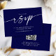 Faites en sorte qu'il soit facile pour vos invités de se rendre à RSVP avec la carte RSVP du site Mariage Céline, au design moderne et épuré. L'avant de la carte invitations invités à répondre via votre site mariage, tandis que l'arrière comprend un code QR personnalisé pratique reliant directement à votre page RSVP en ligne. Le design élégant et minimaliste en bleu foncé (profondeurs nocturnes de la palette de couleurs mariages) s'harmonise parfaitement avec le thème céleste de la suite Mariage Céline, assurant ainsi votre papeterie à la fois élégante et fonctionnelle. Idéal pour les couples qui cherchent à simplifier leur RSVP avec une option numérique, cette carte permet à votre mariage de planifier sans stress.