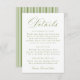 Communicate wedding weekend information with this classic olive green wedding details card, thoughtfully designed to coordinate with botanical and garden-inspired wedding stationery. Graceful olive green calligraphy is balanced with serif lettering for a refined layout. The olive green color palette adds a soft, nature-forward touch, while the green and white stripes on the back provide a polished, heritage-inspired look. Perfect for sharing accommodations, reception details, wedding website information, or attire guidance, this wedding insert card is well-suited for garden weddings, estate celebrations, and outdoor ceremonies. Customize the wording to create a cohesive details insert that completes your wedding suite.