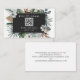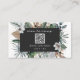 Carte RSVP de mariage avec code qr sur le devant et informations supplémentaires sur le dos. L'avant présente des botaniques tropicaux autour d'un rectangle gris foncé.