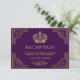 Carte de réception élégante avec une bordure ornementale dorée élégante et une belle couronne sur un fond violet foncé.