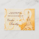 Des perles de billow et bouclent autour d'une sienne brûlée dessinée à la main la Tour Eiffel contre un somptueux damas jaune et orange floral. Un poème d'amour français est faiblement inscrit dans l'arrière - plan crème, fournissant l'accompagnement parfait à la formulation de la carte de site web mariage personnalisable dans le script et la gravure de polices de style. Remettez cette carte à votre ami, famille, vendeurs mariages et à toute personne que vous voulez voir votre site mariage. Vous pouvez également utiliser cette carte comme insertion de site Web mariage pour vos invitations. Voir les couleurs alternatives, et plus de produits. Vous ne trouvez pas ce que vous cherchez ? Si vous avez des demandes - si vous voulez une couleur que vous ne voyez pas, ou si vous ne voyez pas un produit que vous aimeriez inclure dans votre ensemble d'invitation - n'hésitez pas à me le demander ! Je suis heureux de faire des demandes personnalisées; il suffit de cliquer sur "Contact" ci-dessus pour me contacter par Zazzle (assurez-vous d'inclure l'URL du produit qui vous intéresse), ou envoyez-moi un courriel : colleen (at) foreverlogos (dot) com.