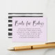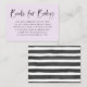 Carte d'enceinte de demande de réservation design et tendance pour votre baby shower fille. L'expression "Livres pour bébé" est affichée en haut d'une police de script d'aquarelle avec lettres à la main contre un arrière - plan violet clair. La conception comporte une demande d'apporter un livre ou d'ajouter votre texte personnalisé. L'envers de la carte de demande de livre présente un motif de bande d'aquarelle noire. Le design s'harmonise avec nos invitations Bonjour Bebe à la douche bébé sur le thème français.
