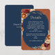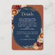 Design automne orangé marine détails mariages floraux Enclôture Carte. Ajoutez une touche d'élégance à votre suite mariage avec cette carte d'enceinte élégante de détails d'automne, aux riches accents orangés et fleuris marine. Parfait pour partager des informations importantes sur le mariage, cette carte complète magnifiquement votre fête sur le thème de l'automne avec sa palette de couleurs chaleureuse et sophistiquée et son design moderne. Idéal pour y inclure des itinéraires, des hébergements ou des détails spéciaux, il s’agit d’un ajout chic et pratique à votre papeterie mariage.