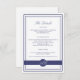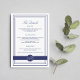 Carte d'information élégante pour les invités de mariage avec monogramme bleu marine et blanc, détails sur l'hébergement et la réception dans un style classique et formel.