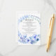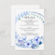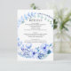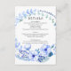 Jolie carte de mariage fleuri au thème vintage/boho, avec une grande couronne de fleurs bleues contre un arrière - plan blanc clair. Cette carte serait idéale pour un mariage à thème botanique ou jardin, et peut être facilement personnalisée avec vos propres instructions pour vos invités mariages pour la grande journée.