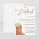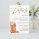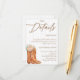 Partagez toutes les informations importantes avec style grâce à cette carte de détails de la Baby Shower Rustique Country, qui présente des bottes de cowgirl vintage, un chapeau de cowboy, des accents floraux et un fond en bois. Parfait pour les baby showers sur le thème western, de grange ou country, cette carte encart est idéale pour inclure les informations de registre, les directions, les détails d'hébergement ou les notes spéciales. Personnalisez-la pour qu'elle corresponde à votre événement et offrez à vos invités tout ce dont ils ont besoin, enveloppé dans un charme rustique !