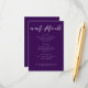 Cette carte de détails de l'événement de mariage royal violet présente une belle typographie blanche sur une carte violette foncée solide pour une cérémonie du soir en hiver. Un script minimaliste et une couleur audacieuse font que vos cartes de réception se démarquent de la foule.