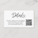 Carte de détails de mariage moderne avec la mention "Détails" dans un script chic. Entrez l'adresse de votre site web de mariage pour créer un code QR que les invités peuvent scanner pour répondre en ligne et obtenir des informations telles que les hébergements et les directions. Le verso présente votre photo superposée avec vos prénoms et la date de mariage.