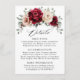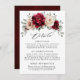 Carte de détails de mariage élégante avec thème floral terreux de rouge Bourgogne, champagne ivoire, avec bouquet élégant de roses Bourgogne, pivoines de couleur champagne ivoire et feuilles d'eucalyptus sauge vert. Veuillez me contacter pour toute aide de personnalisation ou si vous avez besoin d'un autre produit avec ce design.
