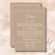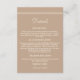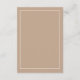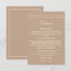 Ajoutez une touche d'élégance discrète à votre jour spécial avec cette carte de détails de mariage personnalisée et minimaliste de couleur taupe, dotée d'un design minimaliste à lignes et d'une typographie crème chic. La police de caractères cursive épurée et la mise en page moderne se détachent sur un fond taupe clair classique, créant l'équilibre parfait entre style et simplicité. Idéale pour un mariage simple et moderne, cette carte de détails comprend un espace pour les informations importantes sur l'hébergement et le mariage que vos invités doivent connaître. Un choix intemporel et raffiné pour compléter votre suite de mariage taupe.