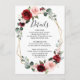 Carte de détails de mariage floral géométrique romantique moderne et élégant avec une aquarelle comprend un bouquet de roses de Bourgogne / marsala, rose blush, violet, pêche avec feuillage assorti. Parfait pour un mariage d'automne / mi-été. Veuillez trouver plus de modèles et de variations assortis dans ma boutique "blissweddingpaperie". Et n'hésitez pas à me contacter pour une personnalisation supplémentaire ou des articles assortis