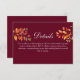 Cette carte de détails mariage de automne présente un riche arrière - plan bordeaux et des feuilles d'automne d'aquarelle peintes à la main dans des teintes chaudes de saison. Utilisez cette carte pour partager des informations importantes avec les clients, y compris votre site Web mariage, le lien RSVP, les détails de la réception, l'hébergement ou les itinéraires. Un ajout élégant et utile à votre suite d'invitation d'automne.