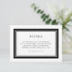 Cette carte de détails mariage classique moderne comporte une couleur modifiable ; pour changer la couleur de la bordure et de l'arrière - plan arrière du noir à la couleur de votre choix, cliquez sur le bouton personnaliser et modifiez simplement la couleur de l'arrière - plan avant et arrière. Personnalisez-le en remplaçant le texte de l'espace réservé. Pour plus d'options comme changer la police, sa taille et l'espacement entre les lettres cliquez sur le bouton "Personnaliser". *Veuillez noter que le filigrane Zazzle qui apparaît dans l'aperçu du zoom n'apparaîtra PAS sur le produit imprimé final. © Bois de rose et agrumes